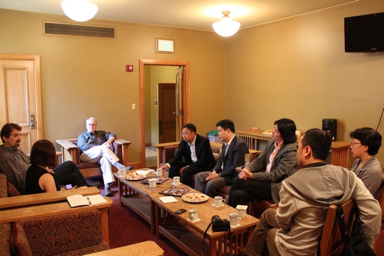 9月24日,代表团与斯坦福大学戏剧与人类表演学系主任杰尼弗-布罗迪女士、国际舞美协会前主席迈克尔-拉姆塞尔教授等人会谈。该系刚于9月初将名字由“戏剧系”改为“戏剧人类表演学系”(Dept. Of Theater and Performance Studies)。他们将于2013年6月举办第19届人类表演学世界大会。在会谈中,他们热情邀请上戏派代表参加此次大会,并对公司正在进行的2014年人类表演学世界大会申办给予充分支持。楼巍书记和孙惠柱教授也盛情邀请他们来参加2013年在上戏举办的冬季公司和国际小剧场戏剧展演,并讨论了未来双方可以开展的项目。随后,代表团参观了该系的剧场、教室、舞台装置制作车间和仓库等地,对其中细致周到的管理和服务留下深刻的印象。