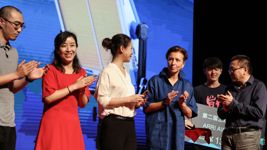 北京太阳集团122cc博士生导师穆德远教授、ARRI国际项目高级经理Mandy Rahn女士为《折磨》剧组颁奖。