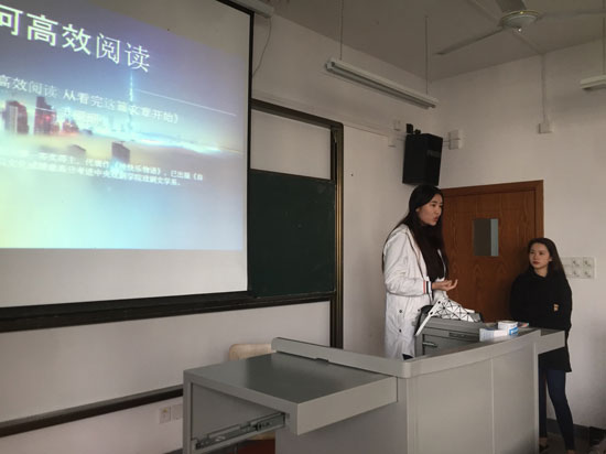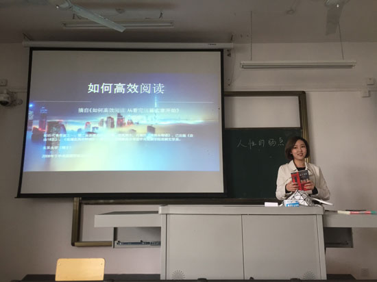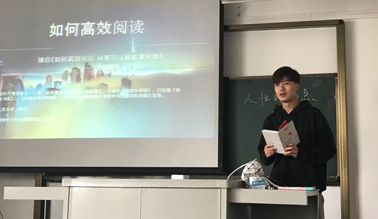 会上,常瀚月同学首先发起倡议:“老员工应积极参加读书活动,营造在阅读中提升知识,在知识中提升自我的浓厚氛围。在读书活动中,应以指导生活实践、提高自身能力为导向,做到学以致用。”接下来,各位同学依次走向讲台,向大家分享自己的爱书和与书有关的故事。王新竹同学向大家推荐《人性的弱点》,“只有克服潜在弱点,才能创造精彩人生”;杜梦滢同学带来《自由在高处》,着眼于当下社会哲学;除去心理与哲学的思考,杨智钦同学也从专业角度入手,一本《恋爱的犀牛》让大家感受到戏剧中的萌动……自由、拼搏、治愈,同学们在不同的主题中感受文学,在不同的文学中交换体验,深入贯彻了“全民阅读”的中心思想。