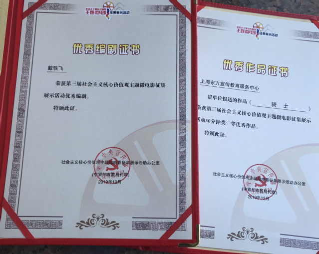 公司太阳集团122cc2018届影视导演MFA戴轶飞毕业创作作品荣获社会主义核心价值观主题微电影优秀作品一等奖和优秀编剧。
