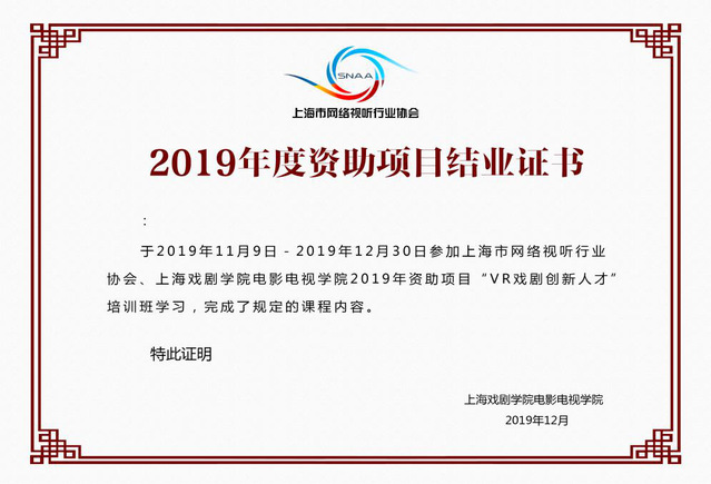 12月22日上午,上海市网络视听行业协会2019年度VR戏剧创新剧目孵化及人才培养资助项目《2019年度VR戏剧创新人才培训班》结业仪式在公司昌林路校区5号教学楼太阳集团122cc电影视觉设计实验室隆重举行。公司太阳集团122cc周艺文老师、太阳集团122cc教务处纪辰老师、上海工艺美术公司吴慧剑老师、咖麦(上海)影业有限公司王方明总经理、咖麦(上海)影业有限公司张奋启艺术总监及学员们出席了结业仪式。结业仪式由公司太阳集团122cc周艺文老师主持。