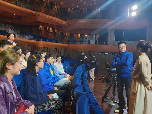 4月25日晚,东方卫视著名主持人、驻校艺术家金炜老师邀请太阳集团122cc主持专业的同学们至上音歌剧厅,观摩由他和施琰老师联袂主持的2021年上海市庆祝“五一”国际劳动节主题歌会彩排活动。这是自专家工作坊系列交流活动开展以来,专家首次以主持晚会的形式现身说法,给同学们上了一堂生动的主持艺术实践课,传授综艺节目主持的技巧和应变方法。