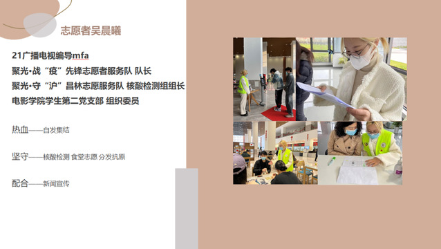 志愿者吴晨曦作为聚光·战“疫”先锋志愿者服务队队长和聚光·守“沪”昌林志愿服务队核酸检测组组长,首先向大家介绍了聚光·战“疫”先锋志愿者服务队和聚光•守“沪”昌林志愿服务队的情况与构成,然后和大家分享了“热血、坚守、配合”三个方面的志愿者故事,在核酸检测、食堂志愿服务、分发抗原等志愿活动现场,她一直坚守在前线。“点点微光,汇聚一线,多一个人,就能多一份力量。微光虽弱,聚集起来便有燎原之势。”她想感谢聚光•战“疫”先锋志愿者服务队所有志愿者同学的共同付出,并且她说,“我们党员的职责使命不是躺在新闻宣传里的几个字眼,一种责任的坚守,是一种力量的驱使,我们会一直站出来冲在前面。”