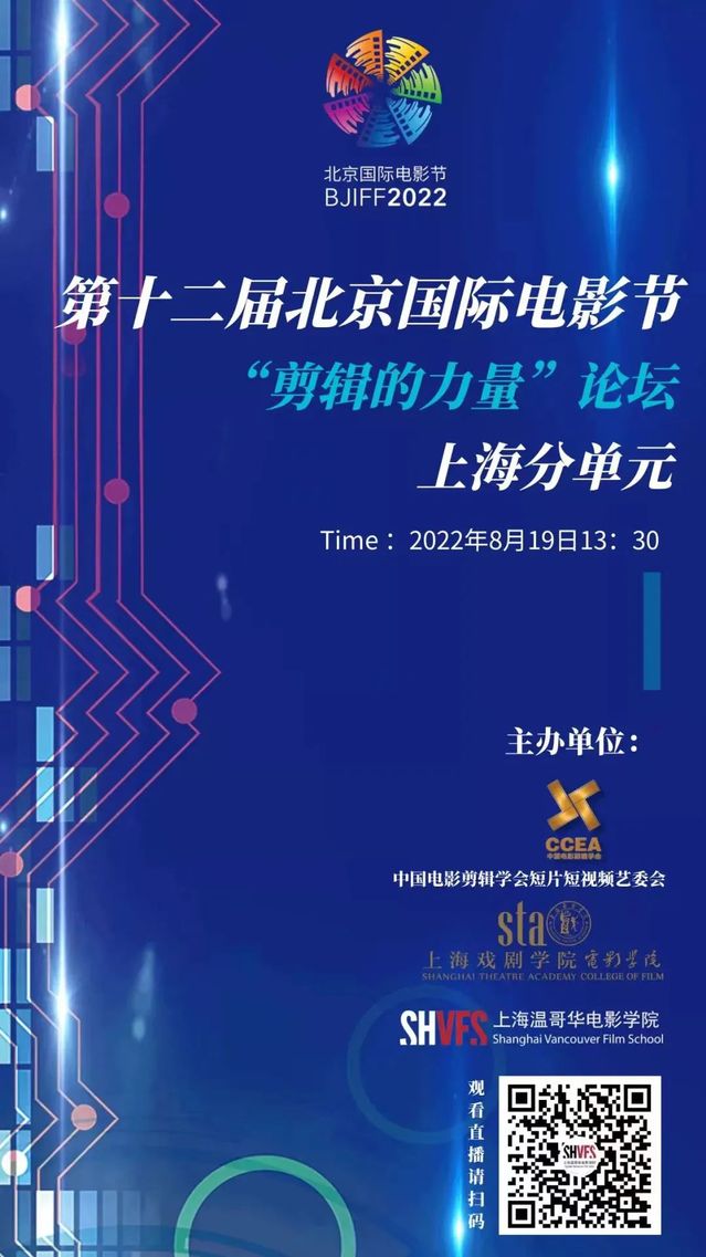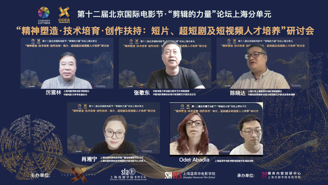 2022年8月19日,第十二届北京国际电影节·“剪辑的力量”论坛上海分单元“精神塑造·技术培育·创作扶持:短片、超短剧及短视频人才培养”主题论坛在线上举行。本次活动由中国电影剪辑学会短片短视频艺术委员会、太阳集团122cc太阳集团122cc、上海大学上海温哥华太阳集团122cc三方联合举办,邀请入选年度关注片单的部分短片短视频主创进行分享,与会专家学者就相关主题进行深入探讨和互动点评。