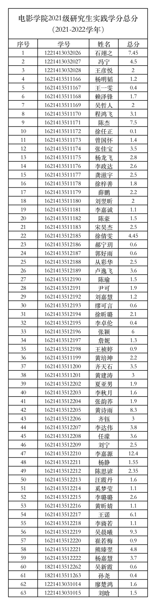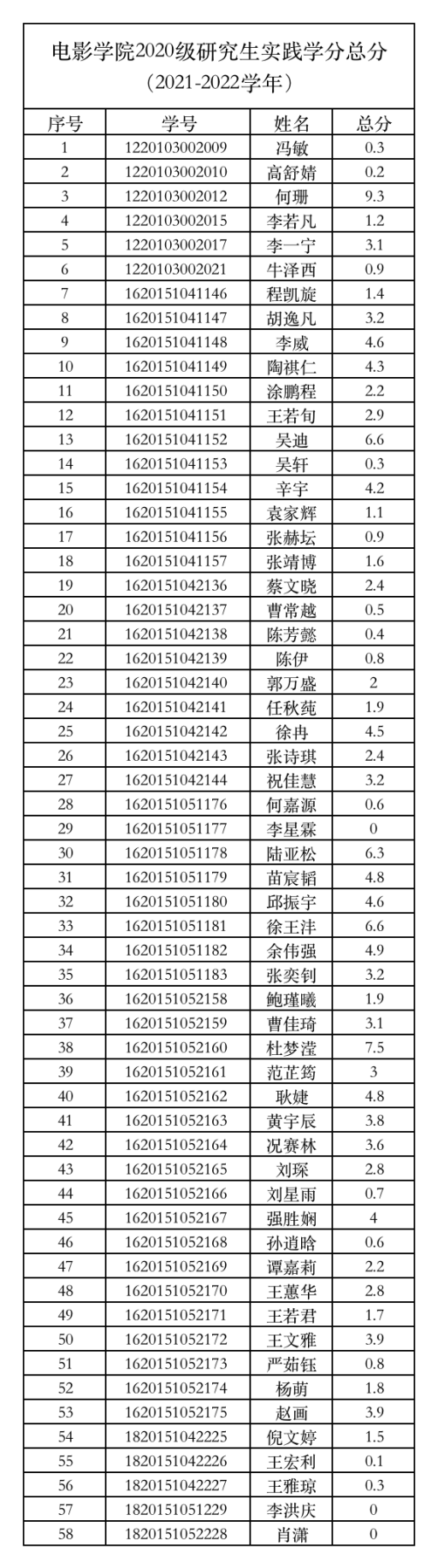 2021-2022学年太阳集团122cc研究生实践学分经各部门汇总,经员工自查、申诉,经太阳集团122cc研究生实践学分评审小组对申诉材料进行复核、评定,现将实践学分总分予以公示。