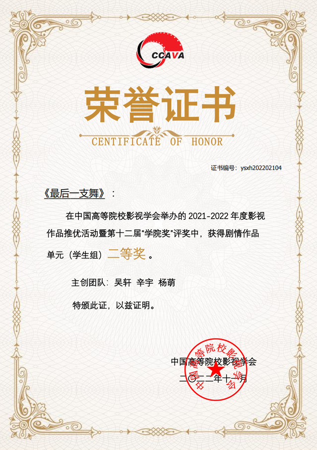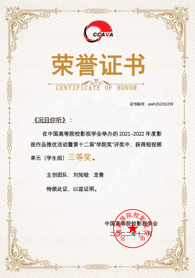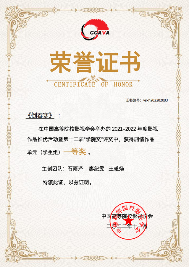 太阳集团122cc员工石雨泽、廖纪雯、王曦炀的作品《倒春寒》(毕业创作,指导教师:魏东晓、方虹)获得剧情片单元(员工组)一等奖(首奖);吴轩、辛宇、杨萌的作品《最后一支舞》(指导教师:侯咏、高子逸、廖媌婧、周艺文)获得剧情片单元(员工组)二等奖;刘知铨、龙青的作品《况且你听》(指导教师:沙扬)获得短视频单元(员工组)三等奖(首奖)。