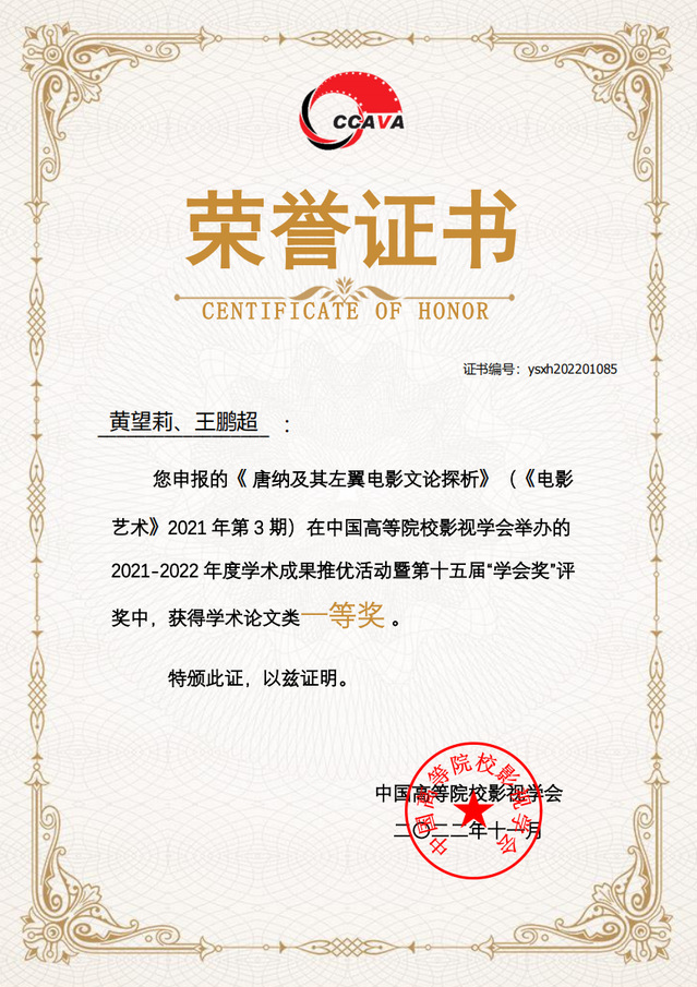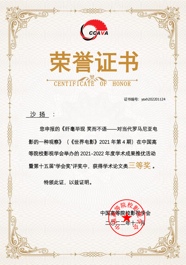 黄望莉教授等的论文《唐纳及其左翼电影文论探析》获论文单元一等奖(排名第六);沙扬副教授的论文《纤毫毕现 笑而不语——对当代罗马尼亚电影的一种观察》获论文单元三等奖(排名第五)。