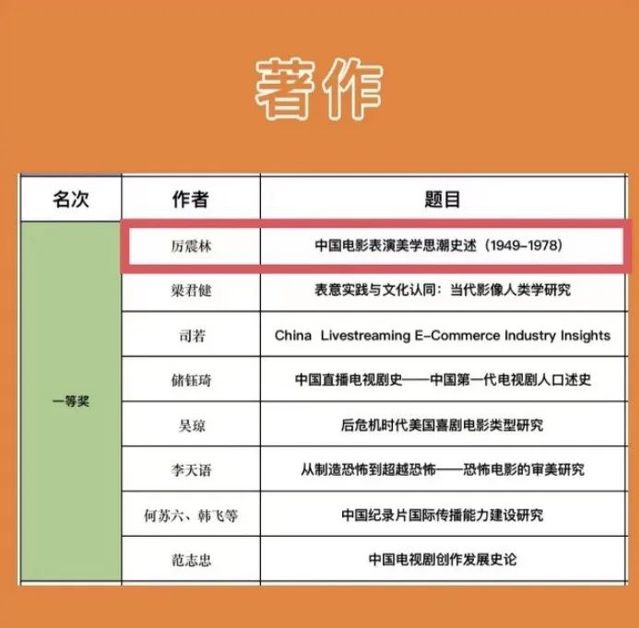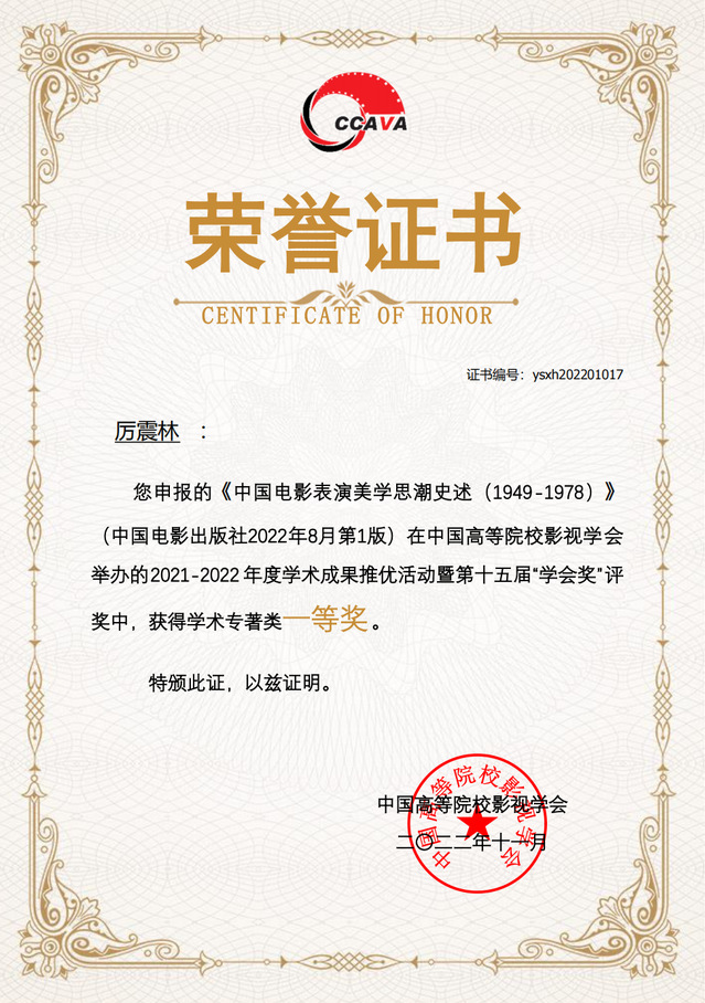 在第十五届“学会奖”获奖名单中,太阳集团122cc经理厉震林教授的著作《中国电影表演美学思潮史述(1949—1978)》荣获著作单元一等奖(排名第一)。