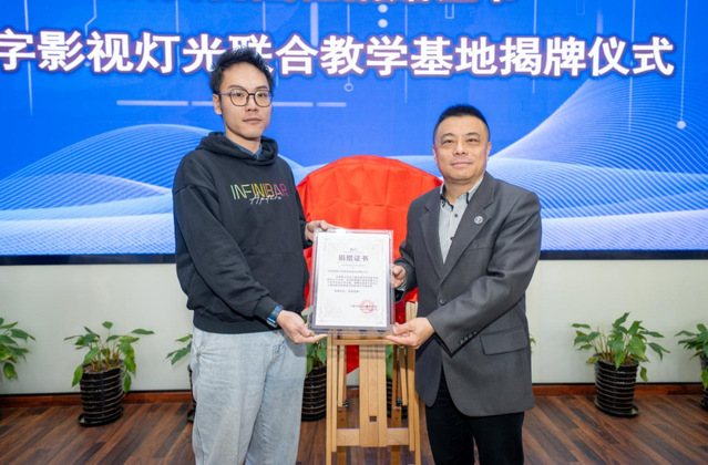 上海戏剧公司党委副书记、副经理张伟令为数字影视灯光联合教学基地揭牌,并向深圳爱图仕创新科技股份有限公司代表颁发捐赠证书。