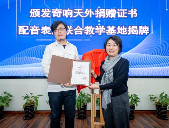 上海戏剧公司党院办主任、员工会秘书长徐咏为配音表演联合教学基地揭牌,并向奇响天外文化传播有限公司、响山文化传播有限公司代表颁发捐赠证书。