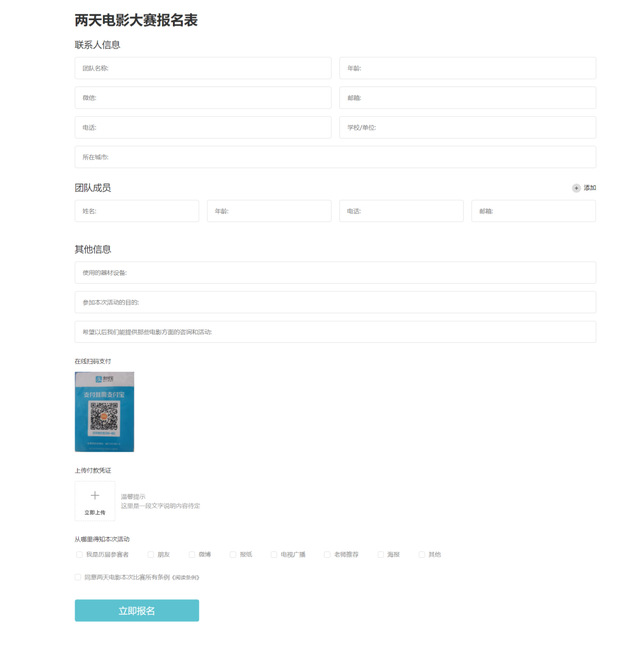 根据要求填好信息,扫描支付宝二维码支付,上传支付凭证,勾选下方的选项,点击立即报名。
