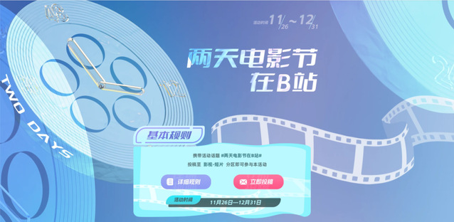 在活动报名时间内,在B站以个人/团队账号发布任意以往作品,添加特别活动主话题 #两天电影节在B站# ,时长>20S的[原创]作品投稿至[影视-短片],即为参与两天电影节B站赛道。