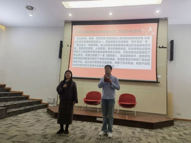 第一乐章由电影作曲系党员教师颜海音与党员同学林海涨共同带领大家回顾了电影作曲系师生为深入贯彻党的二十大精神,参加由上海市组织部、宣传部共同指导的文艺党课的经历。