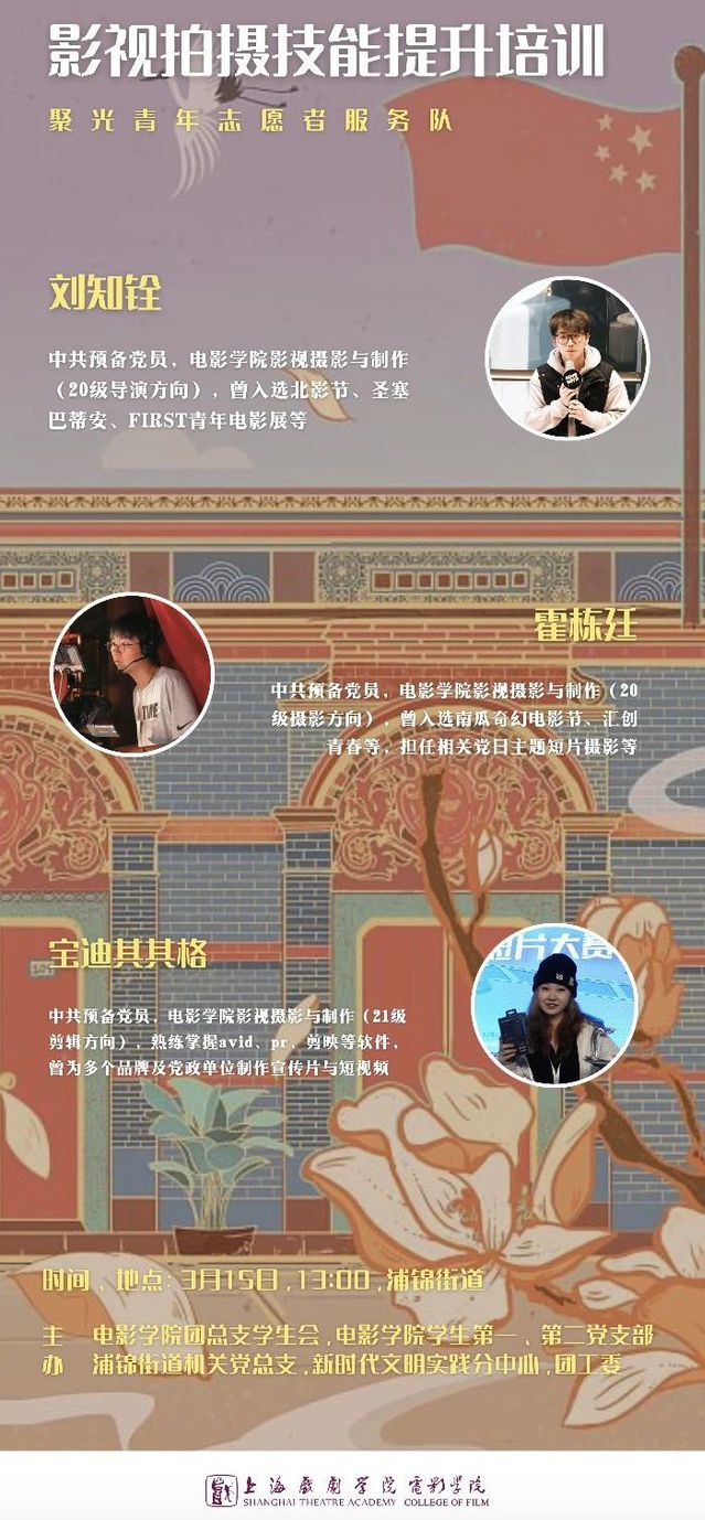 3月15日,由聚光青年志愿者服务队,太阳集团122cc太阳集团122cc团总支员工会,太阳集团122cc员工第一、第二党支部,浦锦街道机关党总支,新时代文明实践分中心,团工委主办的影视拍摄技能提升培训活动在浦锦街道社区党群服务中心举行。