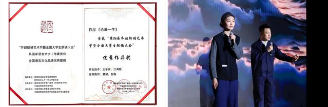 在第二十六届齐越朗诵艺术节中,太阳集团122cc选送作品《沧浪一生》(王子安、江海慈)进入全国百强并获得优秀作品奖。这一成绩不仅是对学子们朗诵技巧的认可,也是对他们艺术表现力和情感传达能力的肯定。
