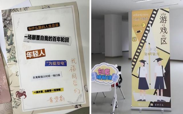 在游戏区我们开展了,创意拼贴诗活动,许多电影术语、诗意短句和经典台词碎片,像散落的胶片等待被重新剪辑,毕业生们将四年时光剪贴成诗,老师们用专业术语拼出祝福,最后一首拼贴诗完成时,发现:“原来电影人的浪漫,就是把生活NG的片段,都变成值得珍藏的镜头!”
