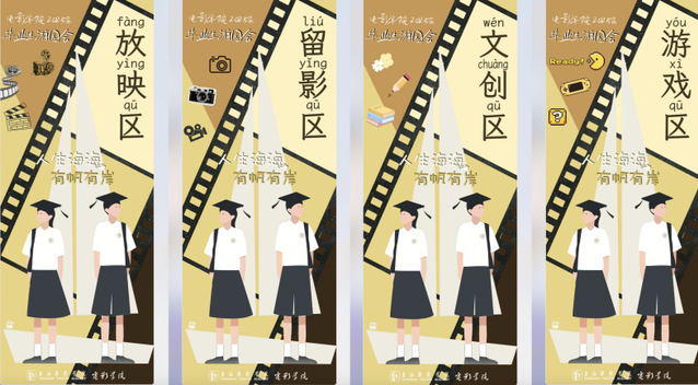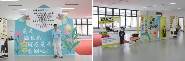 此次留影区占据大厅中央C位,打造了“电影人的夏天”主题拍摄区,配备超高的场记板背景墙,以及仪式感满满的导演椅,为每位毕业生打造电影级效果,同时,还为毕业生设置了“一封给电影人的毕业信”展台、ins风拍立得相框以及多种合影道具。