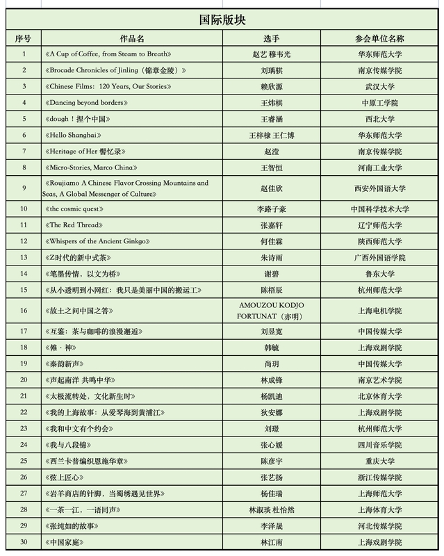 普通话版块入围名单(按照作品首字母顺序排列):