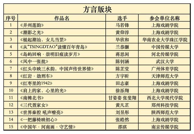 方言版块入围名单(按照作品首字母顺序排列)