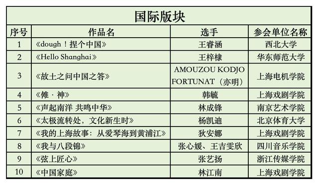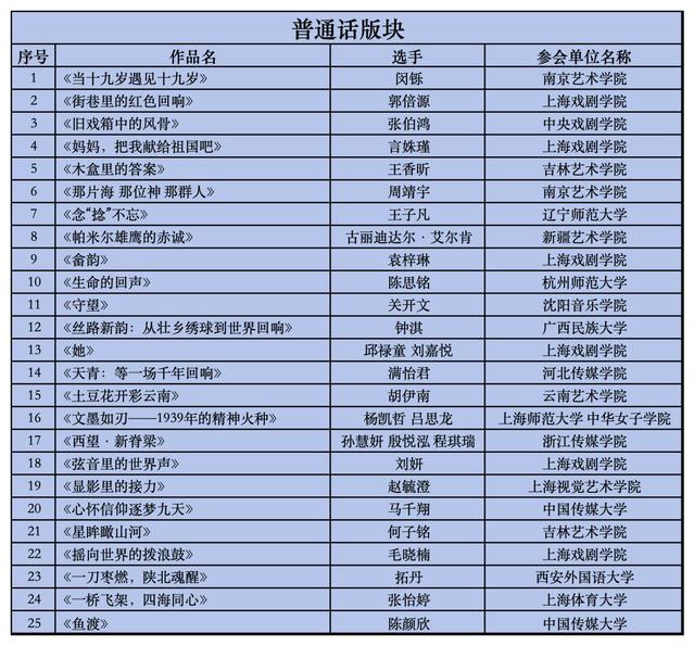 普通话版块入围名单(按照作品首字母顺序排列):