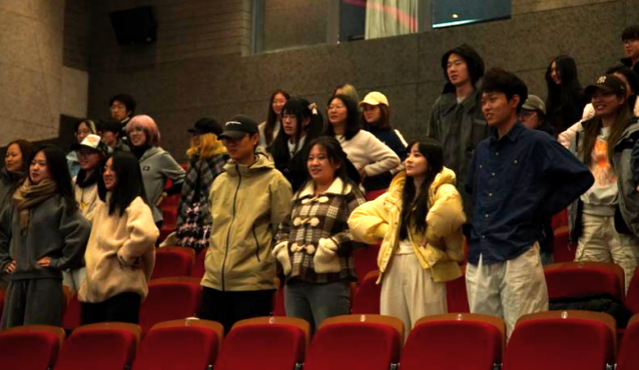 互动环节,主持人戴思瑶邀请大家站起身、手叉腰,模仿影片中遇到困难时召唤“魔法口袋”包奇的设定,带领全场齐声大喊:“嘿,包奇!”整齐又充满活力的呼喊声瞬间点燃现场氛围,既呼应了影片情节,又让同学们卸下紧绷感,在轻松互动中释放了学业与生活的压力。