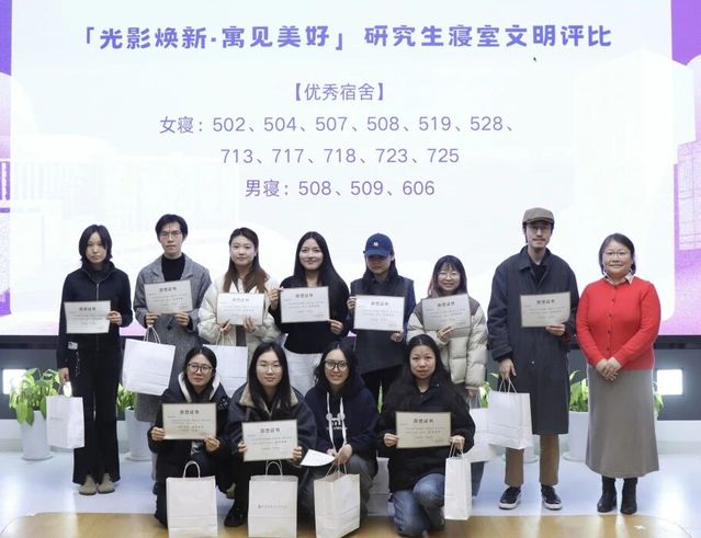寝室文明活动颁奖暨党员寝室挂牌仪式在热烈而庄重的氛围中隆重举行。仪式上,共有22个寝室在「光影焕新·寓见美好」寝室文明评比活动中荣获表彰,其中8个寝室凭借突出表现,被授予“标兵宿舍”;另有14个寝室以其特色和亮点,获评“优秀寝室”。