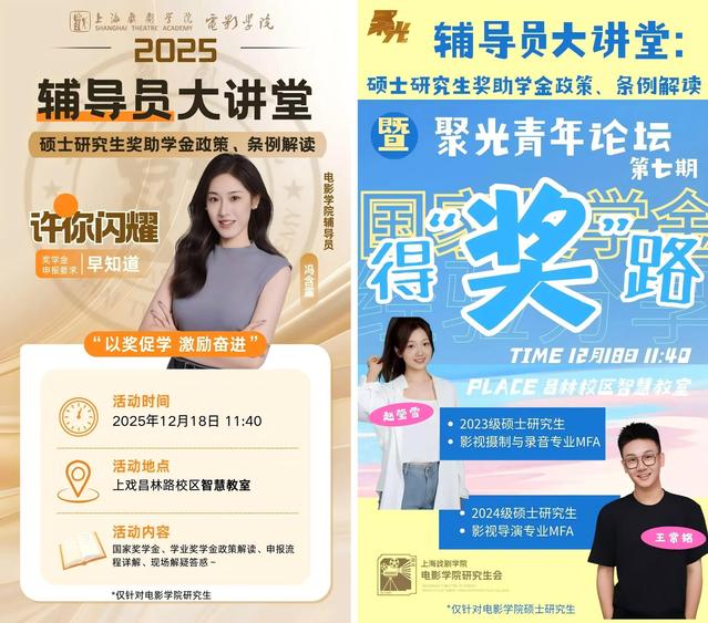 同一时间,我们还将开展第七期“聚光青年论坛”,活动邀请两位国奖获得者——赵莹雪、王常铭同学来分享自己的宝贵经验,面对面解惑答疑,传递“摘星”秘诀。该活动已上线“青春上戏”第二课堂平台,欢迎同学们积极预约!